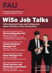 Im Rahmen der „WiSo Job Talks“ (ehemals Brown-Bag-Talks) berichten Referent*innen aus der Praxis von ihrer Tätigkeit und ihrem beruflichen Alltag. Während dieser eineinhalbstündigen Veranstaltung werden den Studierenden wertvolle Praxiseinblicke gegeben, um sie für den vorgestellten Beruf als Karriereoption zu begeistern. In lockerer Atmosphären dürfen die Teilnehmenden darüber hinaus alle Fragen zu Beruf, Unternehmen etc. loswerden.