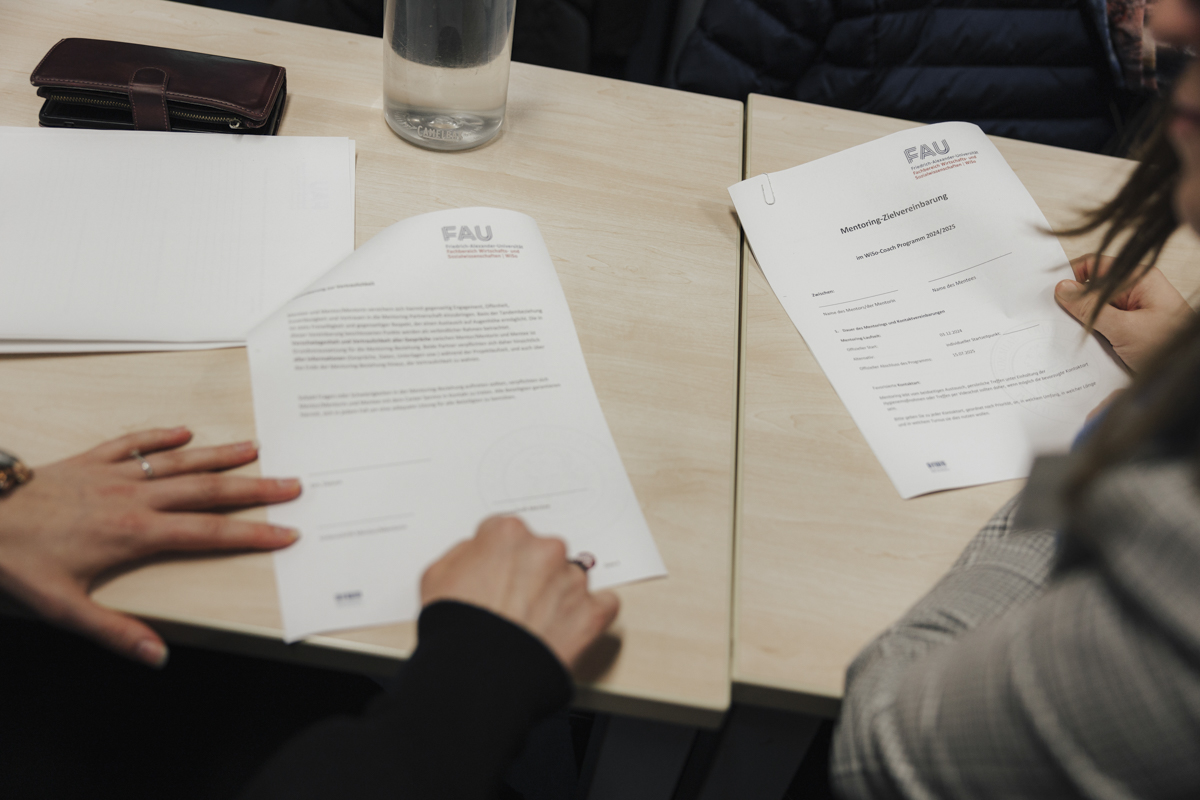Eröffnet wurde der Abend von Vertreter*innen des AWFN und des Career Services. Anschließend standen die wichtigsten Informationen zum Mentoring-Programm im Mittelpunkt, bevor die Teilnehmenden nach einem Kennenlernspiel gemeinsam ihre Mentoring-Vereinbarungen ausfüllten.