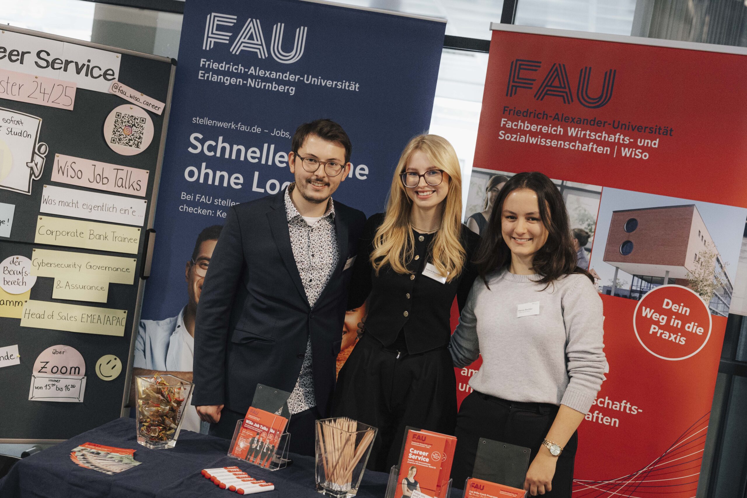 Das Semester neigt sich dem Ende zu und so möchten wir gemeinsam auf die letzten Monate zurückblicken. Gestartet hat das Wintersemester 2024/25 am 14 Oktober mit der jährlichen Semesterbegrüßung und Messe an der Langen Gasse. Hier konnten sich die neuen Erstsemestler*innen an der Universität orientieren und auch den Career Service kennenlernen. Nicht einmal 3 Wochen später startete schon unsere Seminarreihe mit dem ersten Thema „Schlagfertigkeit – Gekonnt kontern!“. Und auch in den folgenden Wochen konnten die Studierenden an Seminare zu den verschiedensten Themen teilnehmen: Von „Storytelling“, „Assessment Center Training“ über „Die Marke ICH“ oder „Die Bewerbung“ zu „Umgang mit Konflikten“ bis zu unserem englischsprachigen Seminar „Interviews and applications to impress“. Aber es gab auch die Möglichkeit, kürzerer Veranstaltungen in Form der WiSo Job Talks zu besuchen! Hier können Unternehmensvertreter*innen ihr Berufsfeld, Aufgabenfelder und ihren Werdegang vorstellen. Dabei haben die Studierenden die Möglichkeit, Fragen zum vorgestellten Beruf, Einstiegsmöglichkeiten, Arbeitsleben und anderen Aspekten zu stellen! Und ebenfalls können diese die Gelegenheit nutzen, um erste Kontakte in ein Unternehmen zu knüpfen. Dieses Semester präsentierten sich Fresenius, Deutsche Bank und Faber Castell, bei denen wir uns für die interessanten und kurzweiligen Einblick bedanken möchten. Ein weiteres großes Highlight war die Auftaktveranstaltung des WiSo Coach Programms Anfang Dezember. Über 30 Mentoren Mentees Teams haben sich an diesem Abend kennenlernen können und so gemeinsam das einjährige Mentoring begonnen.